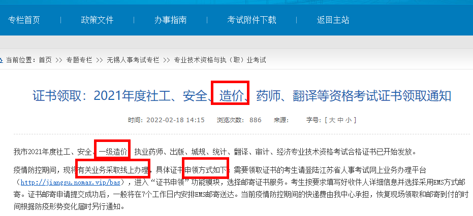 江蘇無(wú)錫2021年度一級(jí)造價(jià)工程師資格考試證書領(lǐng)取通知
