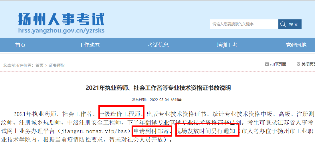 江蘇揚(yáng)州2021年一級造價工程師證書發(fā)放說明