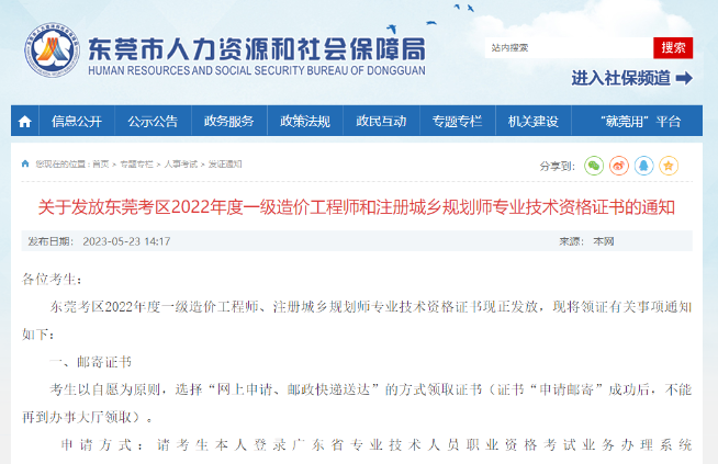 廣東東莞關(guān)于發(fā)放2022年度一級(jí)造價(jià)工程師職業(yè)技術(shù)資格證書(shū)的通知