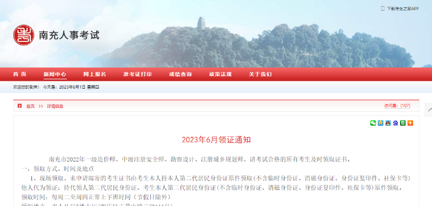 南充人事考試發(fā)布了《2023年6月領(lǐng)證通知》,包含一級(jí)造價(jià)工程師證書領(lǐng)取相關(guān)事宜。詳情如下: