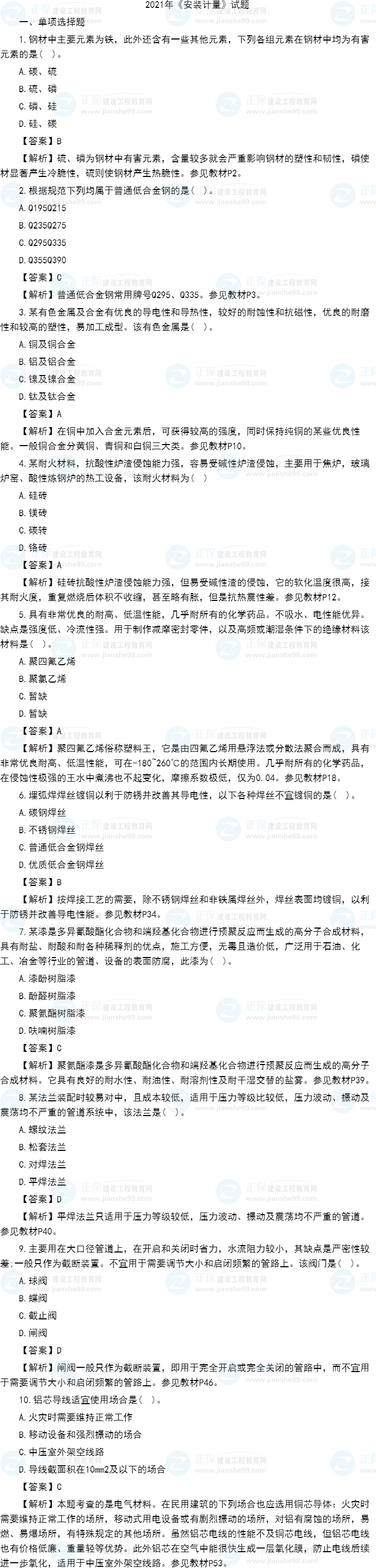 2021年一級造價師《安裝計量》試題答案及解析1-10