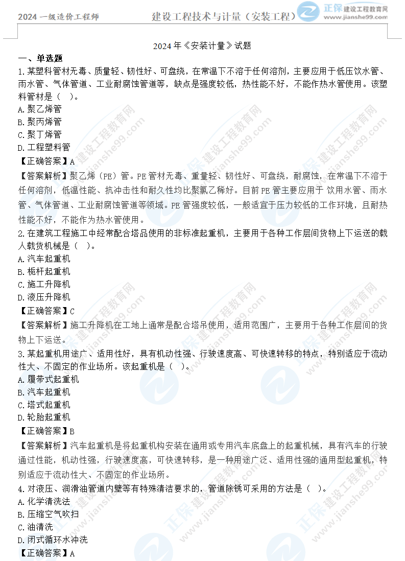 更多題目點(diǎn)擊下載2024年一級造價(jià)師建設(shè)工程技術(shù)與計(jì)量(安裝)真題及答案解析