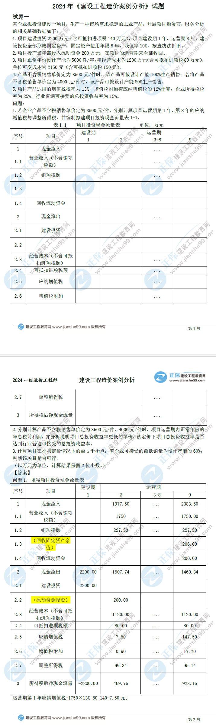 2024年一級(jí)造價(jià)師建設(shè)工程造價(jià)案例分析(土建)真題及答案解析