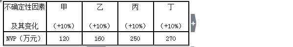 【解析】本題考查的是敏感性分析。敏感度系數(shù)(甲)=[(120-200)/200]/10%=-4;敏感度系數(shù)(乙)=[(160-200)/200]/10%=-2;敏感度系數(shù)(丙)=[(250-200)/200]/10%=2.5;敏感度系數(shù)(甲)=[(270-200)/200]/10%=3.5;絕對(duì)值甲因素最大,所以甲因素為最敏感的因素。參見(jiàn)教材P192~193。