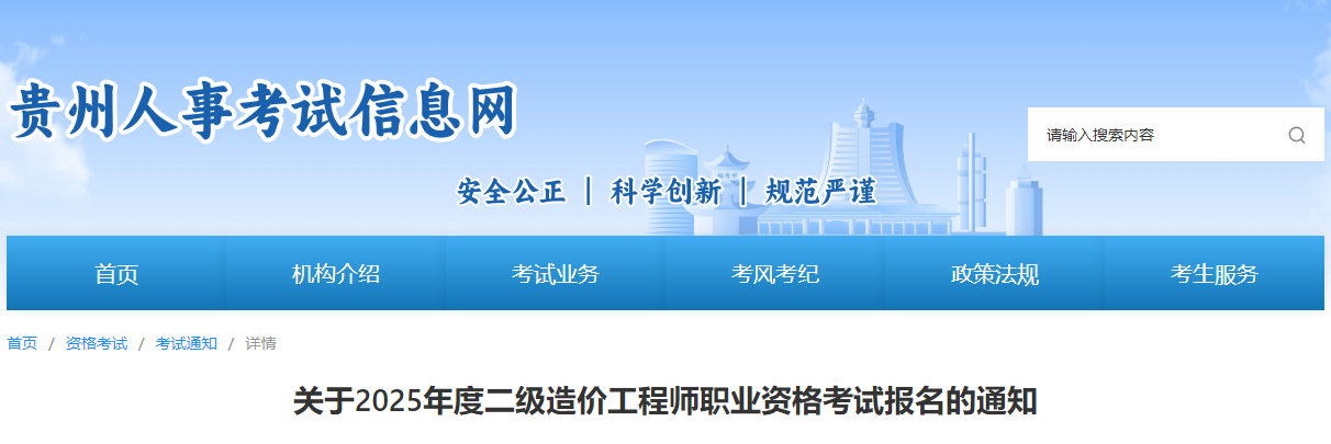 貴州省人事考試信息網(wǎng)發(fā)布關于2025年度二級造價工程師職業(yè)資格考試報名的通知,詳情如下: