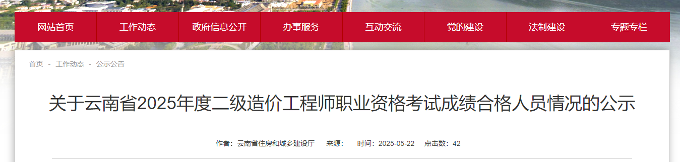 云南省2025年度二級造價工程師職業(yè)資格考試成績合格人員名單開始公示!考試成績合格人員856人情況在云南省住房和城鄉(xiāng)建設(shè)廳門戶網(wǎng)站(https://zfcxjst.yn.gov.cn/)予以公示(2025年5月22日至28日),以廣泛接受社會監(jiān)督。通知原文: