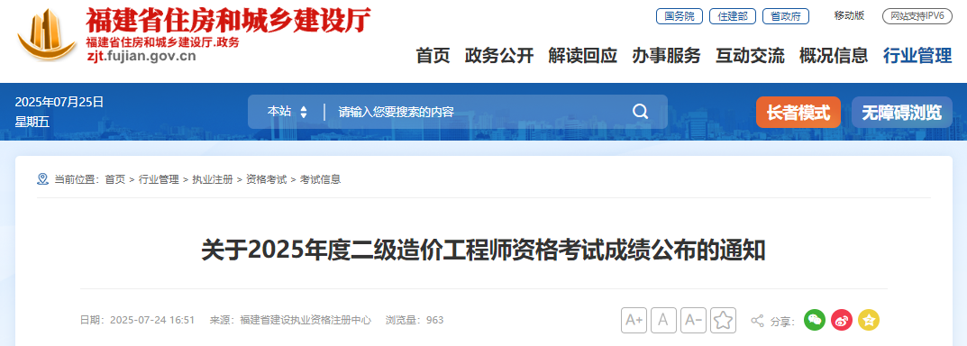 福建考區(qū)2025年度二級(jí)造價(jià)工程師資格考試成績(jī)于7月28日開通