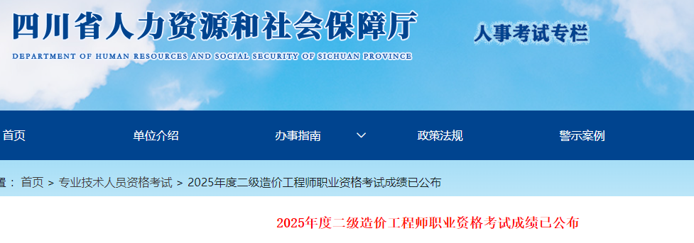 2025年度二級造價工程師職業(yè)資格考試成績已公布,請各位考生從四川省人力資源和社會保障廳官網(wǎng)“人事考試”專欄進入2025年度二級造價工程師職業(yè)資格考試專題,選擇“2025年度二級造價工程師職業(yè)資格考試成績查詢專用通道”進行查詢。