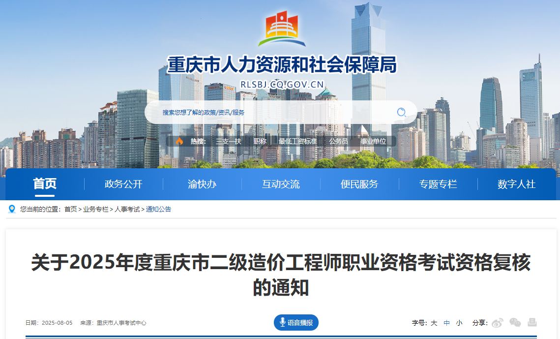 重慶市2025年度二級造價工程師職業(yè)資格考試資格復(fù)核通知已發(fā)布,網(wǎng)上復(fù)核受理時間為:2025年8月6日9:00—8月12日10:00。官方通知如下: