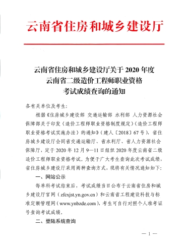 云南省住房和城鄉(xiāng)建設(shè)廳關(guān)于2020年度云南省二級(jí)造價(jià)工程師職業(yè)資格考試成績(jī)查詢的通知
