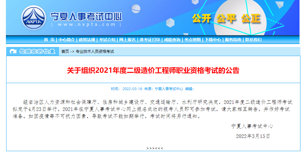 寧夏人事考試中心公布了關(guān)于組織2021年度二級(jí)造價(jià)工程師職業(yè)資格考試的公告,2021年推遲的二造考試終于來啦!考試時(shí)間擬定與4月23日舉行,2021年在寧夏人事考試中心網(wǎng)上報(bào)名成功的報(bào)考人員即可參加考試。請考生相互轉(zhuǎn)告,做好考試準(zhǔn)備!