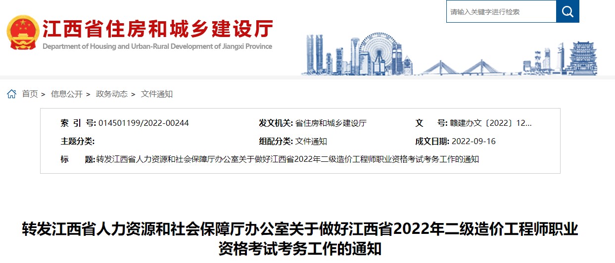 江西住建廳轉(zhuǎn)發(fā)關(guān)于做好2022年二級造價工程師資格考試考務工作的通知
