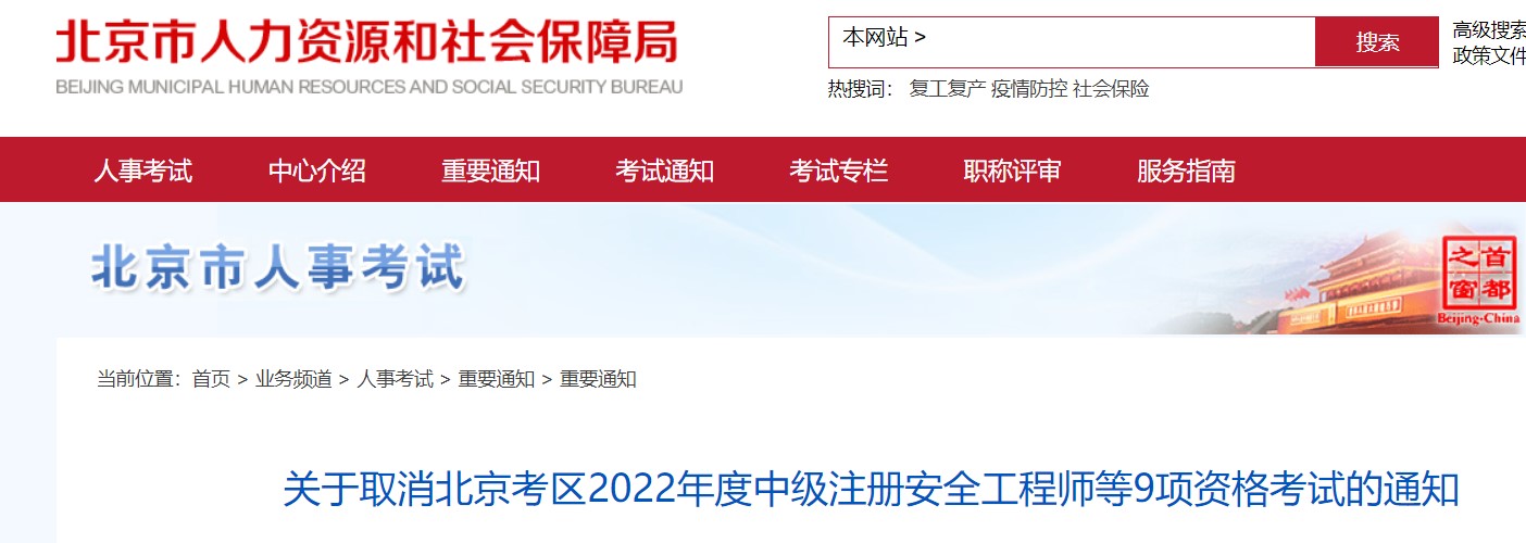 關(guān)于取消北京考區(qū)2022年度中級注冊安全工程師等9項資格考試的通知