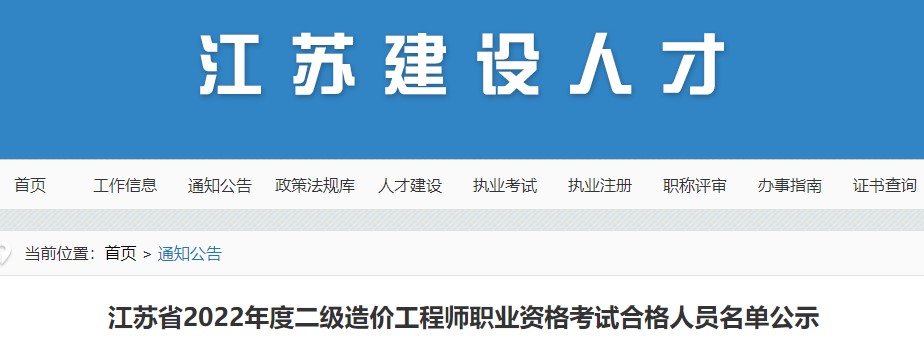 江蘇省2022年度二級造價工程師職業(yè)資格考試合格人員名單公示