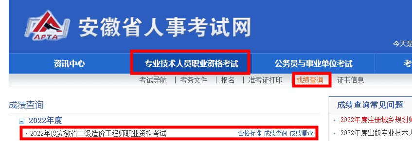 成績(jī)查詢(xún)?nèi)肟冢喊不帐∪耸驴荚嚲W(wǎng)-專(zhuān)業(yè)技術(shù)人員職業(yè)資格考試-成績(jī)查詢(xún)