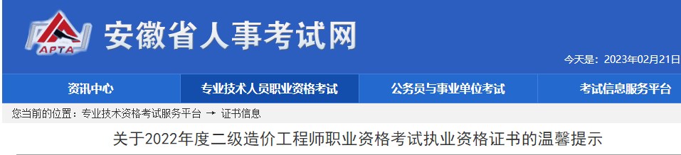 安徽省關(guān)于2022年度二級(jí)造價(jià)師考試執(zhí)業(yè)資格證書(shū)的溫馨提示