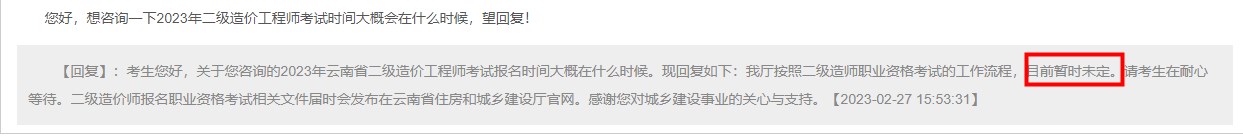 云南省22年二級(jí)造價(jià)師補(bǔ)考順利結(jié)束,23年考試時(shí)間在什么時(shí)候?近日,有考生就23年二造考試時(shí)間的問(wèn)題詢問(wèn)了云南省住建廳,得到的回復(fù)如下。
