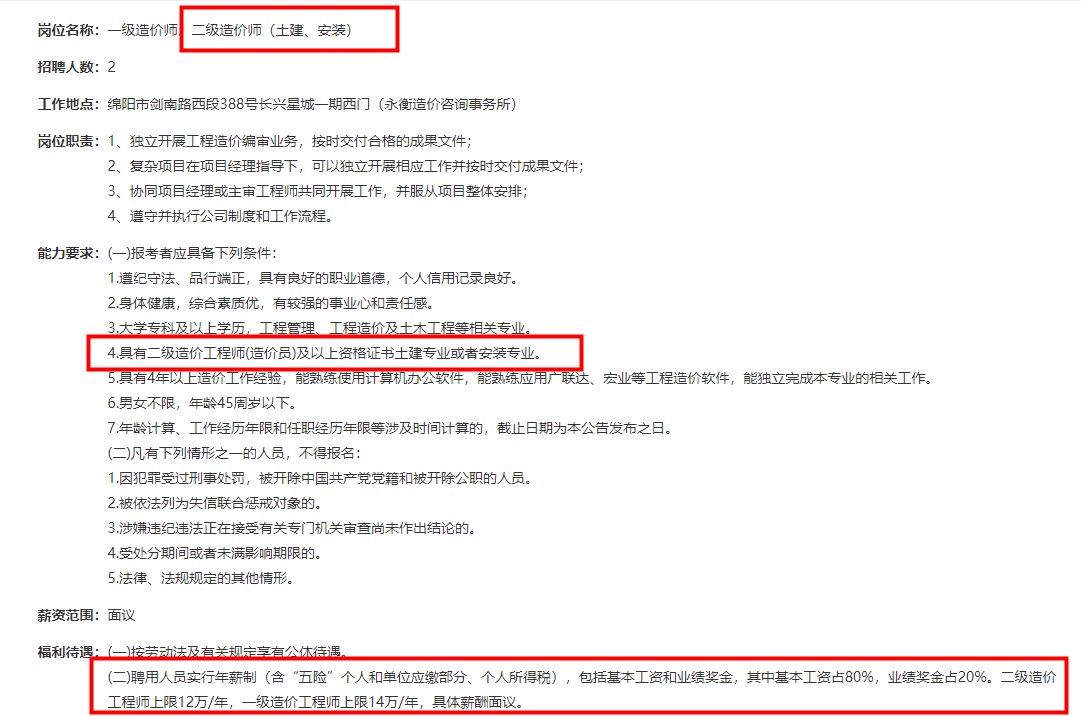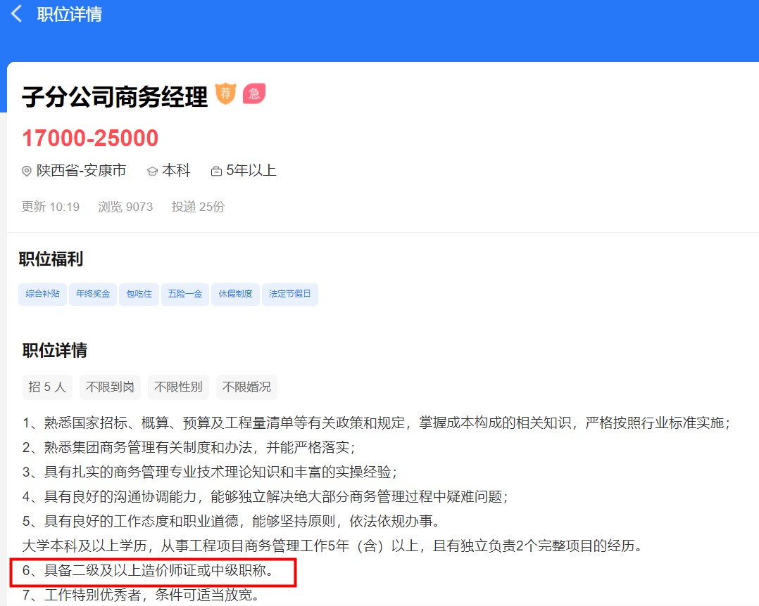 二造證書還是邁入行業(yè)的門檻,各大公司招聘要求都標(biāo)明擁有二級造價師證書優(yōu)先!