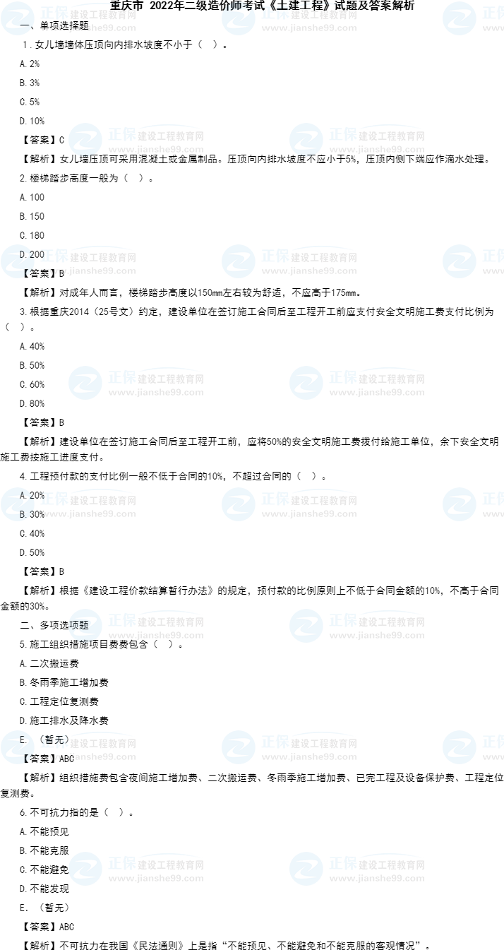 重慶市 2022年二級(jí)造價(jià)師考試《土建工程》試題及答案解析(部分)