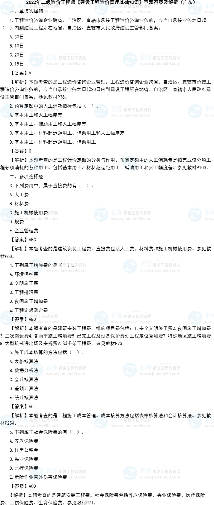 廣東?2022年二級(jí)造價(jià)師《建設(shè)工程造價(jià)管理基礎(chǔ)知識(shí)》試題答案及解析