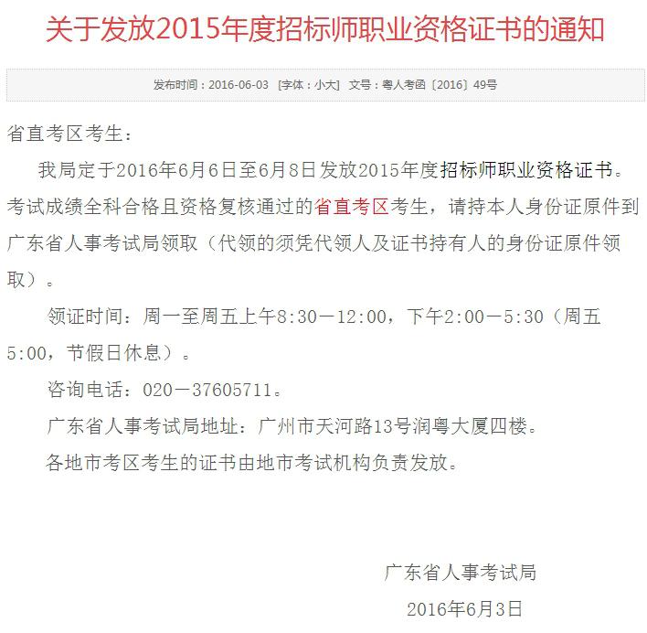 摘要:廣州地區(qū)2015年招標師考試證書可以領取了,領取時間為2016年6月6日至6月8日,周一至周五上午8:30-12:00,下午2:00-5:30(周五5:00,節(jié)假日休息)。領取地址為廣州市天河路13號潤粵大廈四樓。