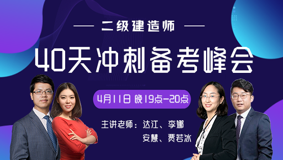 距離2019年二級建造師考試還剩不到兩個月的時間,考生們你們準(zhǔn)備好了嗎?40天如何進(jìn)行高效復(fù)習(xí)?40天如何進(jìn)行合理分配?必做題型及知識點是否都已掌握?想要在40天內(nèi)突破重重障礙,取得最后勝利,4月3日二建沖刺備考峰會不能錯過!建設(shè)工程教育網(wǎng)老師達(dá)江、李娜老師帶領(lǐng)考生們360°深度解析40天備考技巧,解決考生們備考中的重重困惑。