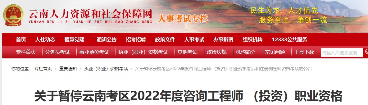 關(guān)于暫停云南考區(qū)2022年度咨詢工程師(投資)職業(yè)資格考試的公告