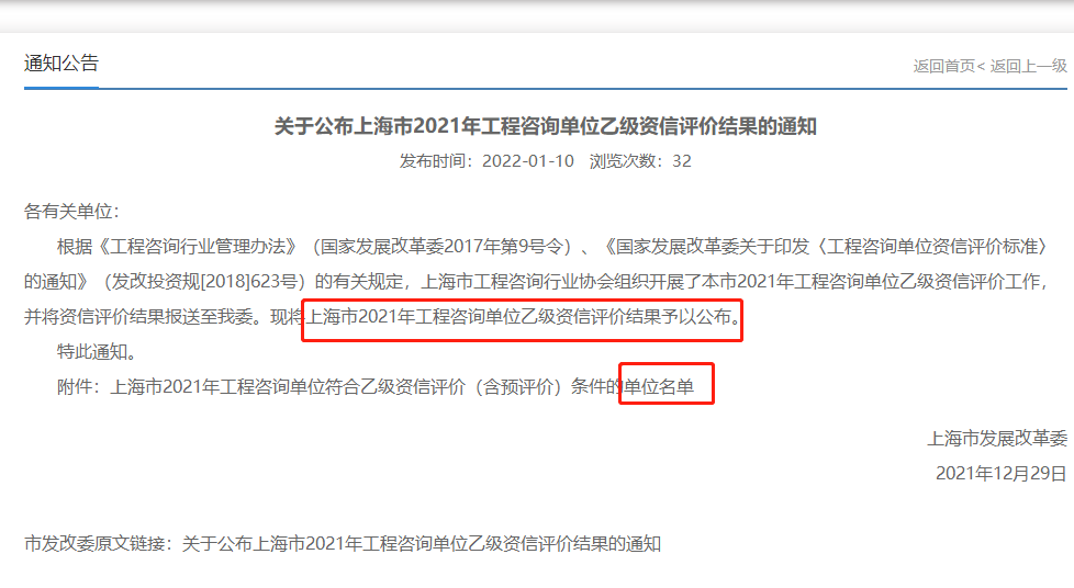 市發(fā)改委原文鏈接:關(guān)于公布上海市2021年工程咨詢單位乙級(jí)資信評(píng)價(jià)結(jié)果的通知