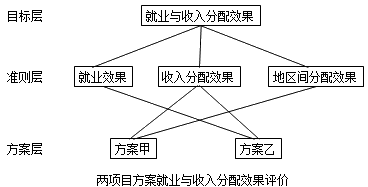 通過(guò)對(duì)“就業(yè)效果”、“收入效果”和 “地區(qū)間分配效果”三因素兩兩比較。評(píng)價(jià)者從對(duì)“就業(yè)與收入分配”貢獻(xiàn)的角度,得到的結(jié)果寫(xiě)在下面3×3的判斷矩陣中: